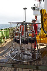 Once on station, the crew set to work deploying the conductivity, temperature and depth (CTD) sensor array on a metal frame also equipped with a rosette of 24 sampling bottles that is lowered into the ocean. The CTD enables collection of water samples at different depths in the water column along with data collected by the sensors. Once collected, the samples are analysed for levels of dissolved inorganic carbon and plant pigments. The taxonomy of the phytoplankton is determined using flow cytometry, light microscopy and scanning electron microscopy.