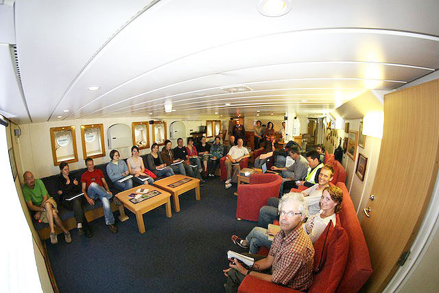 Upon first entry into the ship, it looked rather like the inside of a warehouse, with cardboard boxes and plastic crates piled high everywhere inside the various laboratory spaces. Gradually the clutter and congestion has diminished as instruments have been taken out of their containers and set up on benches, some boxes and crates have been stowed away, and various pieces of equipment have been unpacked. From looking like a warehouse, frenetic activity has transformed the laboratories into something actually resembling laboratories. Those scientists responsible for setting up the purpose-built laboratory containers for the bioassay experiments (of which more in future blog entries) have been especially busy, putting up racks, light panels and electrical wiring. A vast number of screws, ties, strap, bungee cords and ropes have been used to tie down each and every item of equipment, to prevent it being able to fall over or crash around in the event of rough seas.